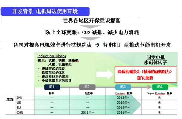 SIAIF推出可有效減少工業(yè)電機(jī)電力消耗的軸承占40%,目前該產(chǎn)品已開始銷售。 隨著世界范圍內(nèi)環(huán)保意識(shí)的提高,所有產(chǎn)業(yè)均在推進(jìn)二氧化碳的減排和電力的節(jié)能。尤其是給泵、送風(fēng)機(jī)及壓縮機(jī)等機(jī)械提供驅(qū)動(dòng)力的工業(yè)電機(jī),其電力消耗占世界消耗總電量的40%以上。針對(duì)這些需求,各國(guó)均制定了旨在提高工業(yè)電機(jī)效能的相關(guān)法規(guī)。